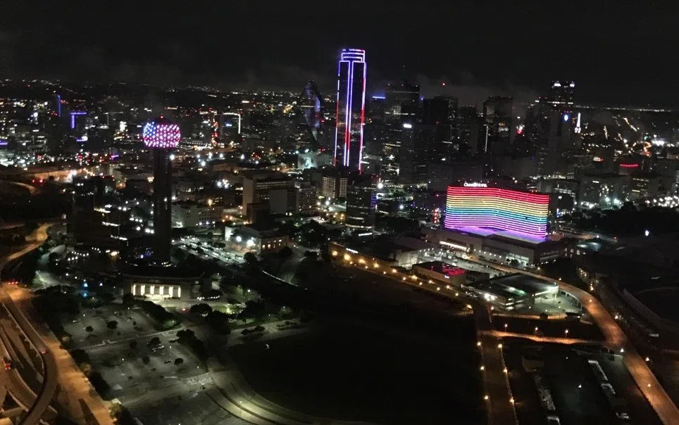 Photograph courtesy of Dallas Air One/@DPDAir1/Twitter. DALLAS (WBAP/KLIF News) – The Dallas skyline was lit up Sunday night in support of the victims in the Orlando massacre. The Omni had rainb...