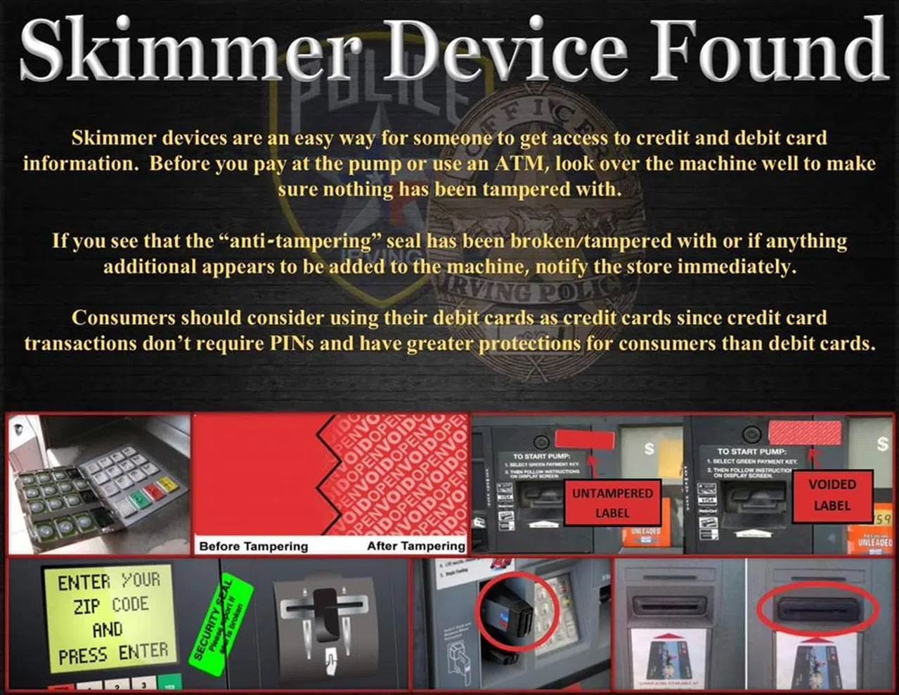 Image courtesy of the Irving Police Department. IRVING (WBAP/KLIF News) – Police in Irving have issued an alert for consumers to take caution when using a debit card at ATMs and gas pumps. A rel...