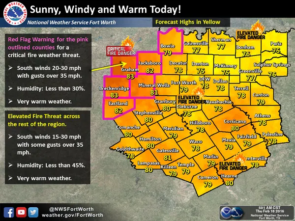 Image courtesy of the National Weather Service in Fort Worth NORTH TEXAS (WBAP/KLIF NEWS) The danger for wildfires is high with how windy it is across North Texas. Tarrant County Fire Marshal, Randy R...