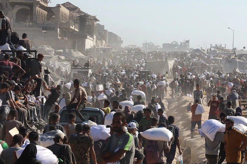 GAZA – AUGUST 4: Palestinians flock to the humanitarian aid distribution point near Zikim Border Gate to receive limited food supplies as hunger deepens amid ongoing Israeli attacks and blockade...