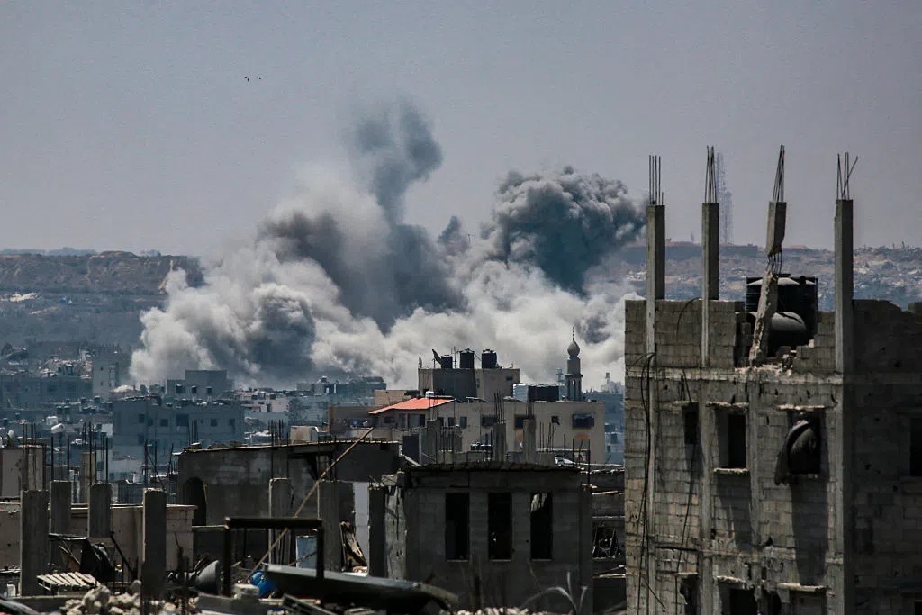 This picture taken from western Jabalia in the central Gaza Strip shows smoke billowing east of Gaza City, in the central Gaza Strip following Israeli strikes on July 13, 2025. Delegations from Israel...